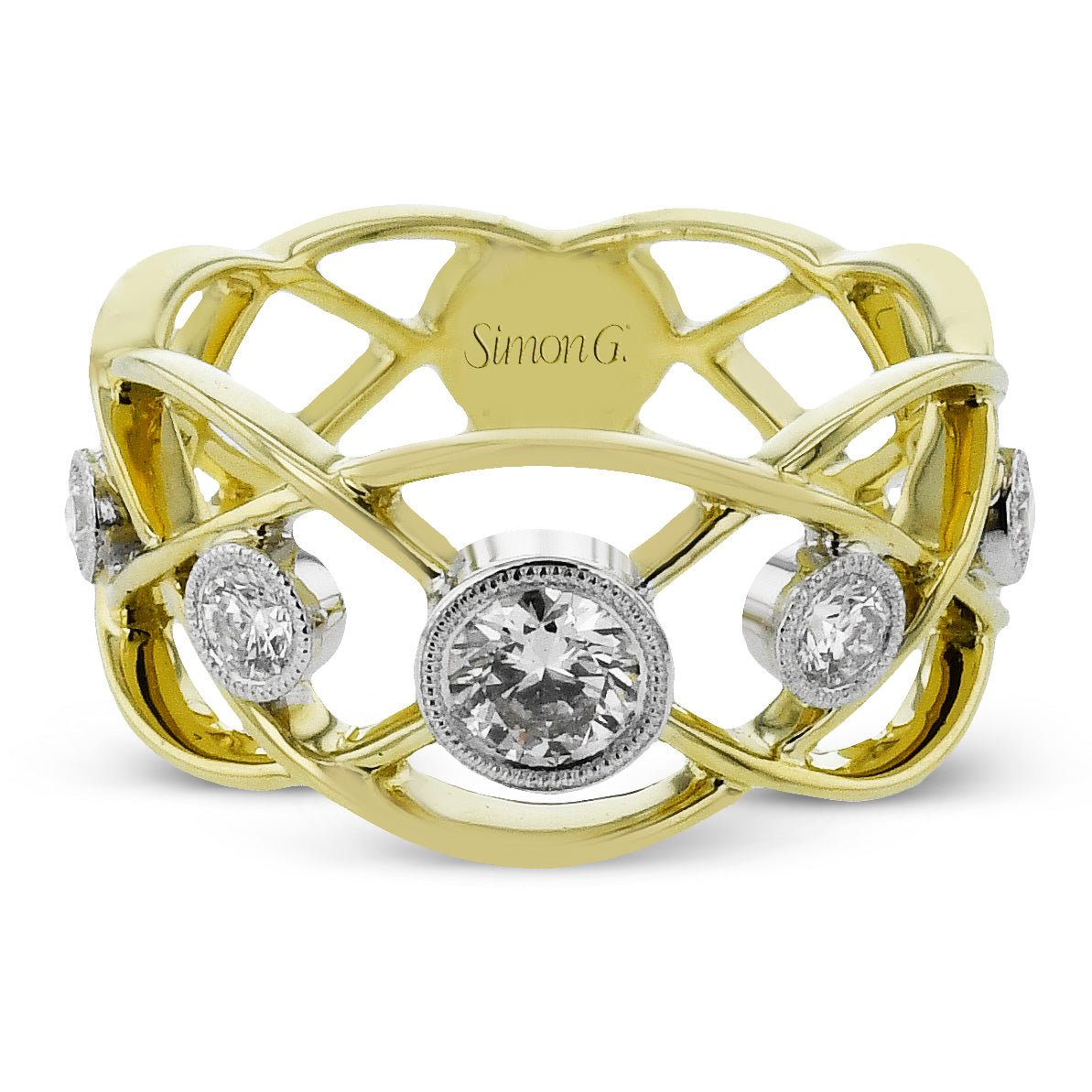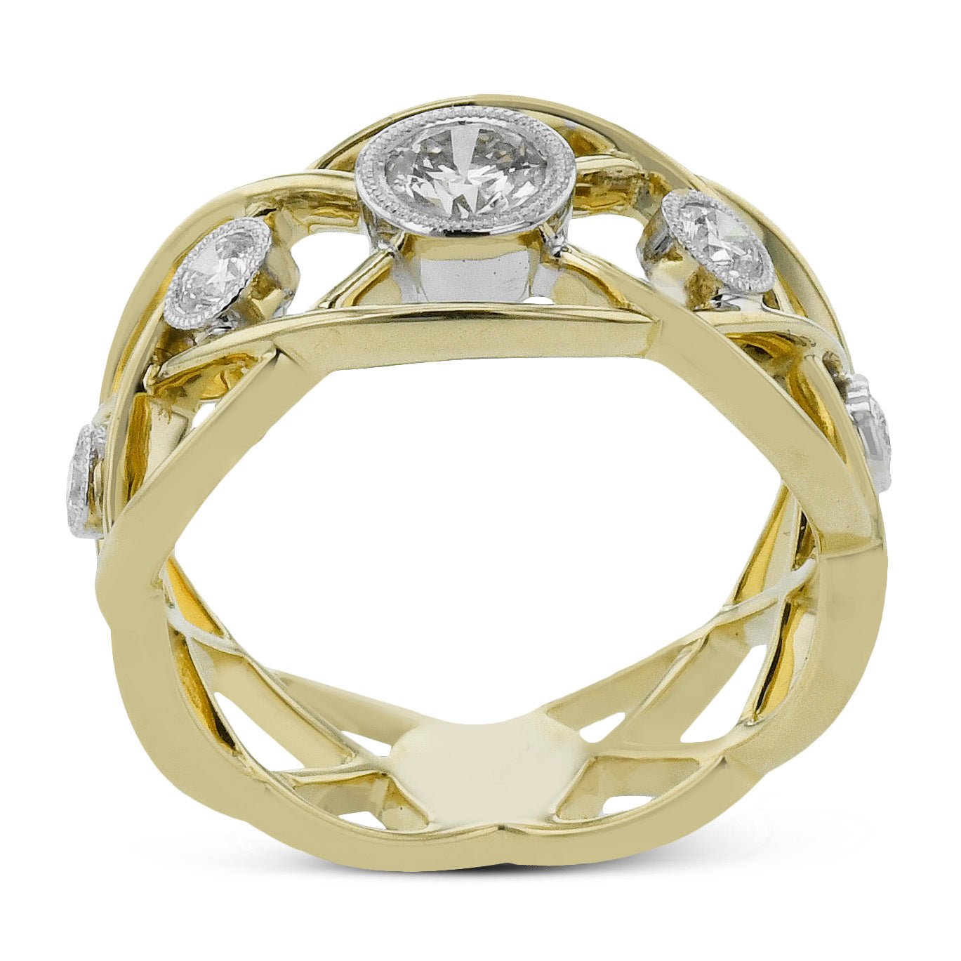 This distinctive, two-tone ring features an open-weave design and sparkling, bezel-set diamonds that appear to be floating along its length.