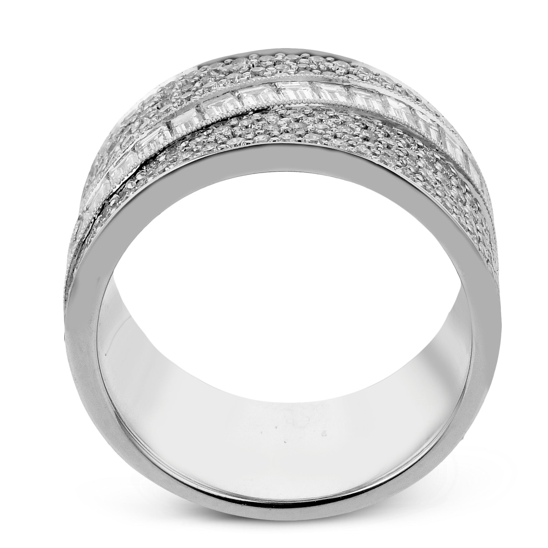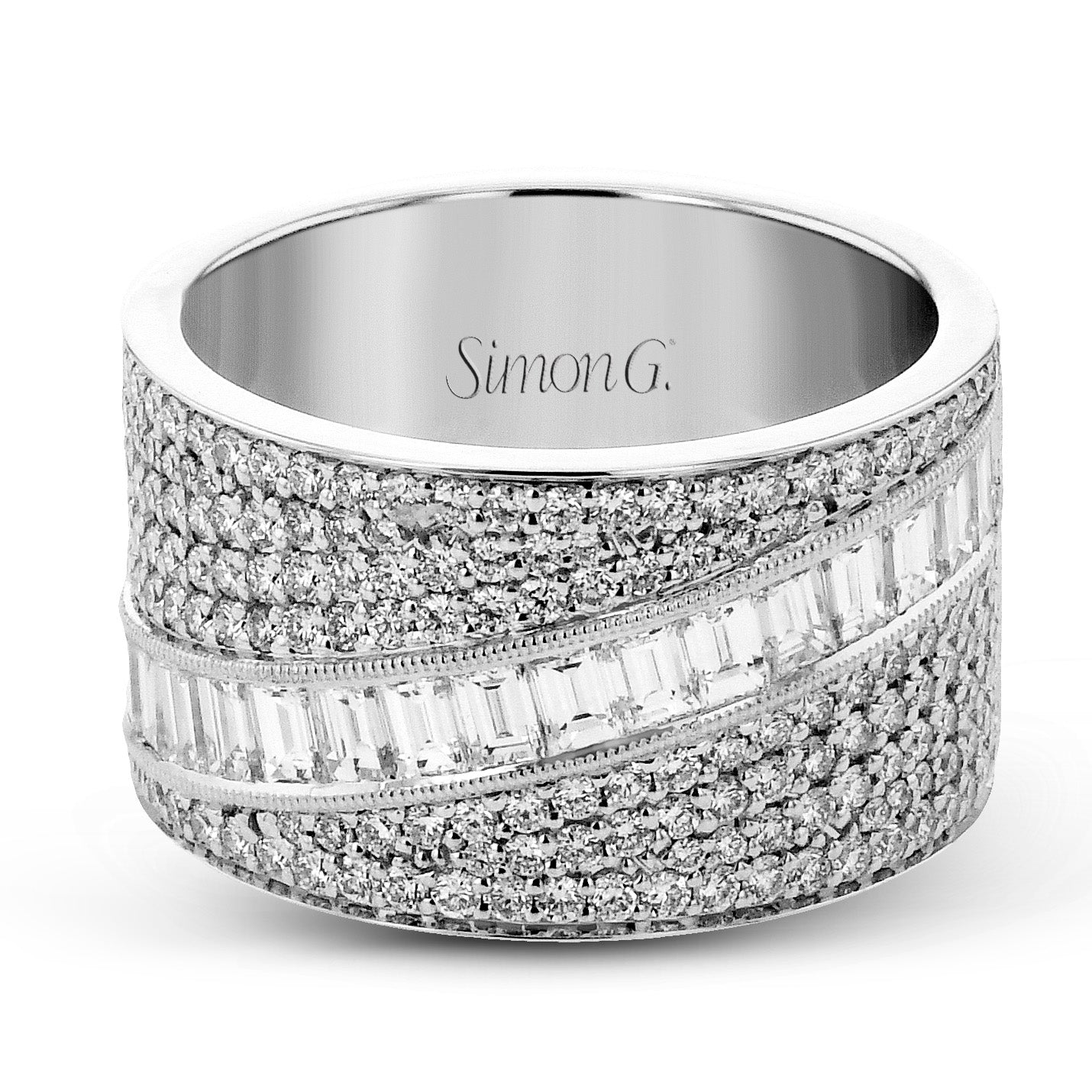 This gorgeous ring boasts multiple rows of sparkling round diamonds and a distinctive diagonal band of brilliant baguette diamonds.