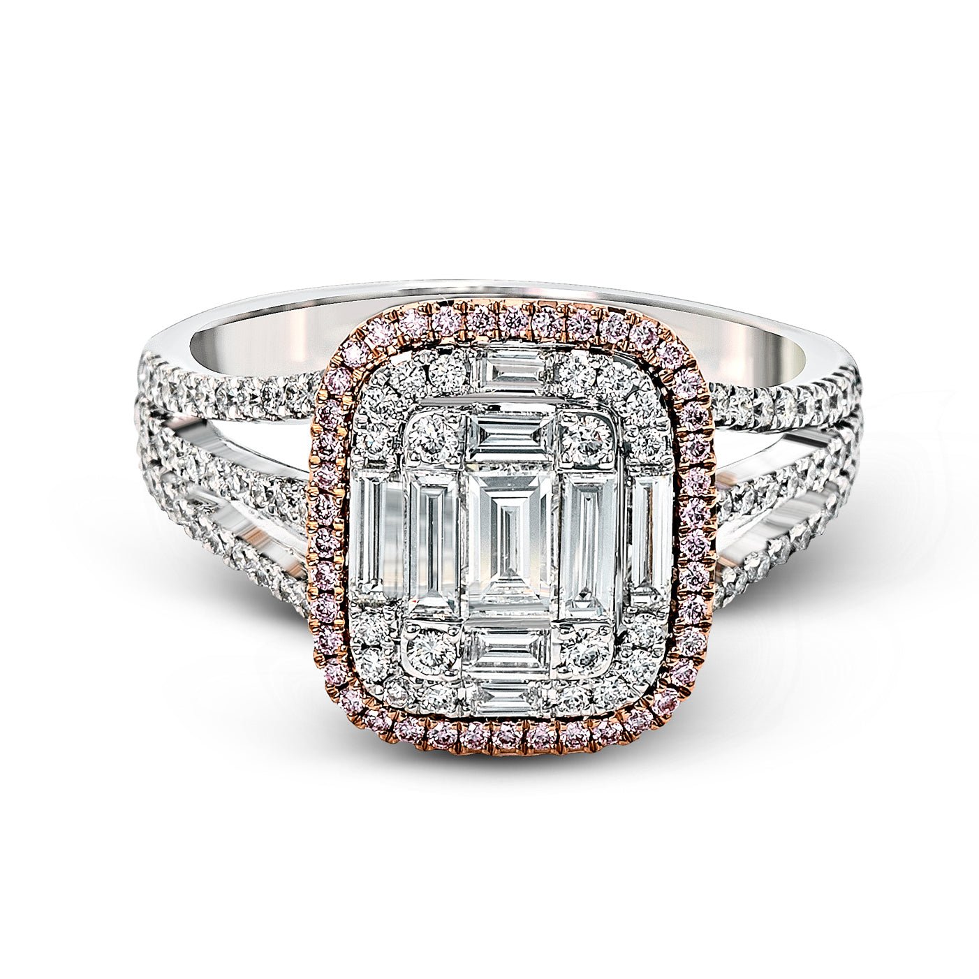 Featuring an eye-catching geometric setting, this contemporary ring is accented bya shimmeringcombinationof round white and pink diamonds,as well as brilliantbaguette diamond highlights.