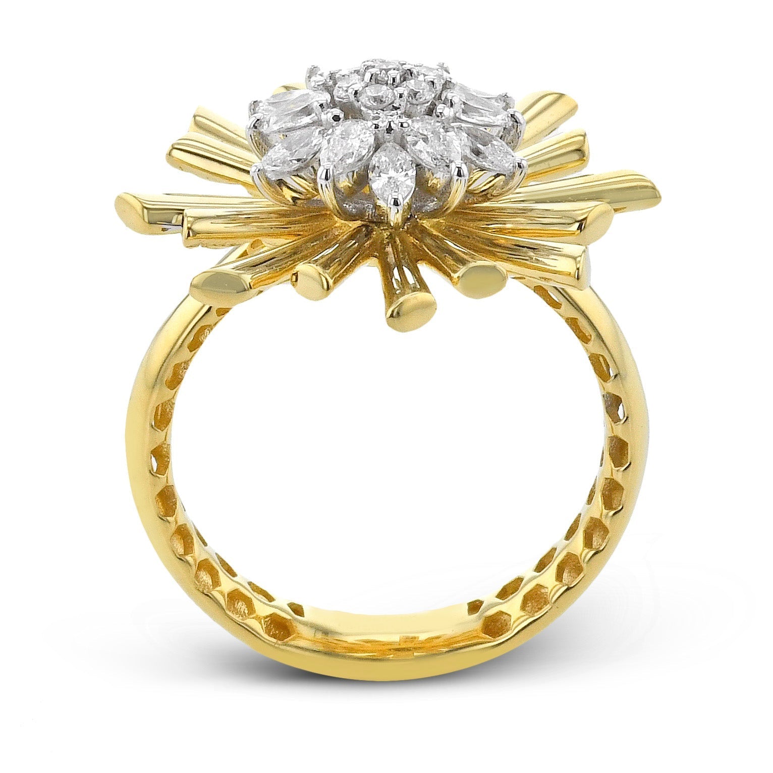 This eye-catching ring features a sun ray design with radiating yellow gold stalks below a beautiful flower formed by a dazzling combination of round, marquise and pear diamonds set in white gold.