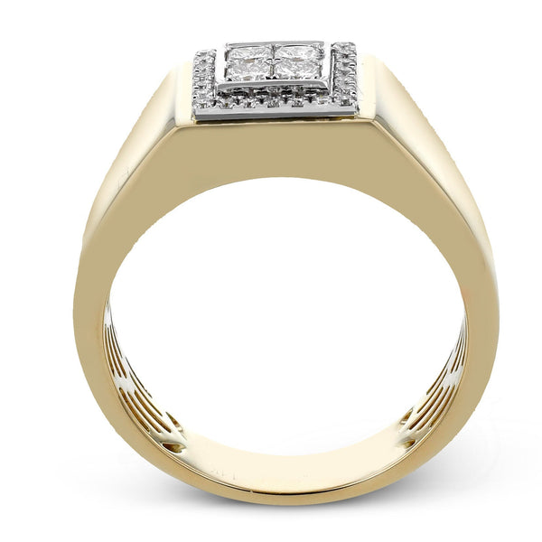 This ring in 18K gold features a bold yet refined design, showcasing a square cluster of princess-cut diamonds set in a sleek bezel
