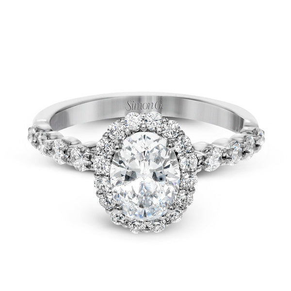 This beautiful ring features a shimmering halo and is adorned with dazzling white diamonds.