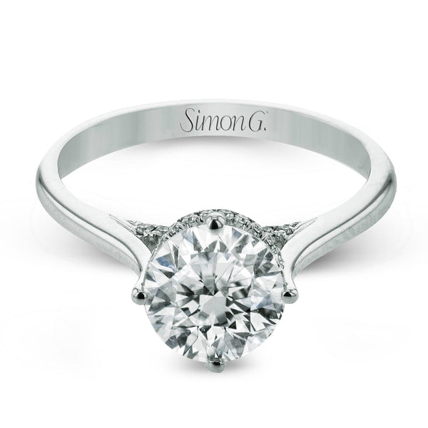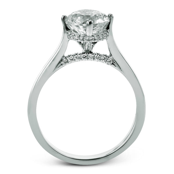 This elegant engagement ring is adorned with a delicate hidden halo and features sparkling diamonds along the side profile under the setting.