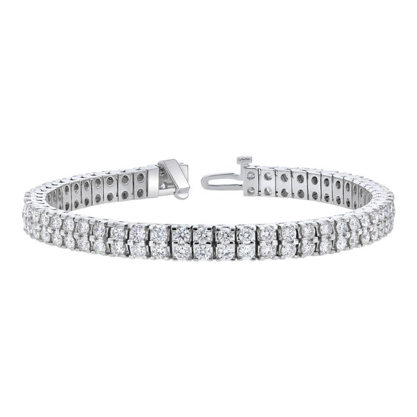 14K white gold tennis bracelet set with 6.5 ct. round diamonds in two rows. Very comfortable on the wrist. The bracelet is 7 inch long and secured with box clasp with locking latch safety.