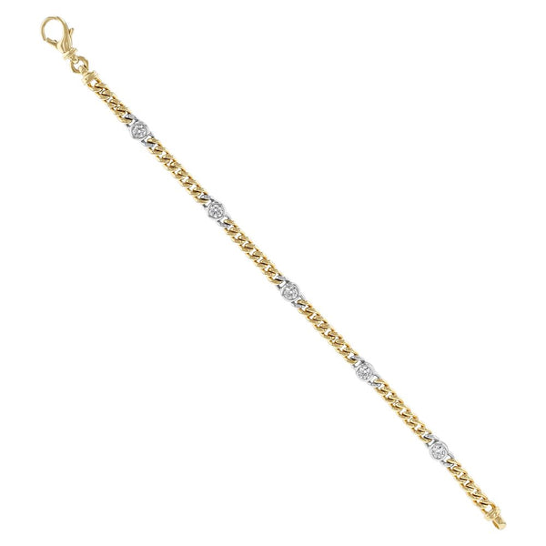 14K yellow gold curb link bracelet set with 5 diamonds total 1.0 ct. in white gold bezels. The bracelet weighs approx. 15 grams, 7.5 inch long and locks with lobster clasp.