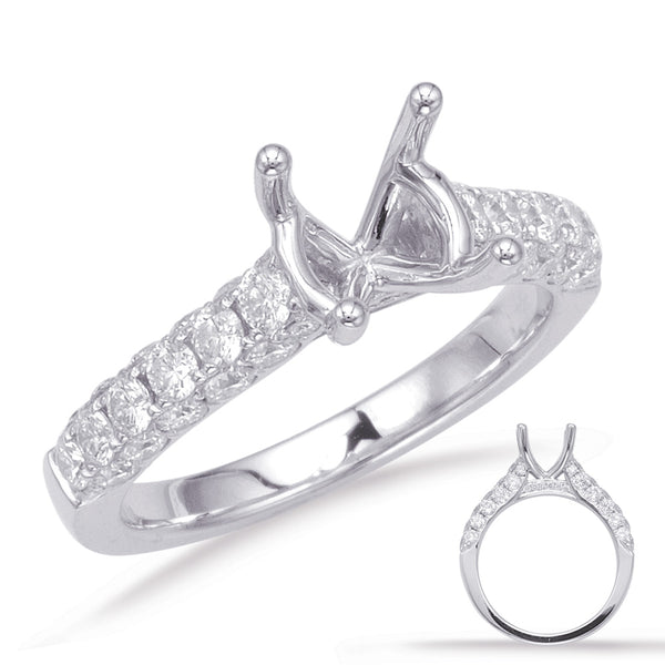 This Engagement Ring is available in 14K White Gold. There are a total of 48 stones. There are Rounds with a total carat weight of 1.08 set in a Micro Prong|Prong Set setting.