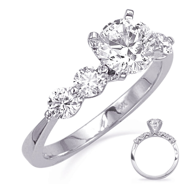 This Engagement Ring is available in 14K White Gold. There are a total of 4 stones. There are Rounds with a total carat weight of 0.64 set in a Shared Prongs setting.
