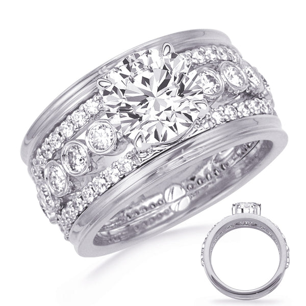 This Engagement Ring is available in 14K White Gold. There are a total of 46 stones. There are Rounds with a total carat weight of 0.85 set in a Bezel Set|Prong Set setting.