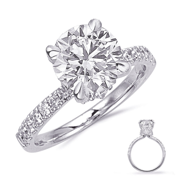 This Engagement Ring is available in 14K White Gold. There are a total of 22 stones. There are Rounds with a total carat weight of 0.6 set in a Micro Prong setting.