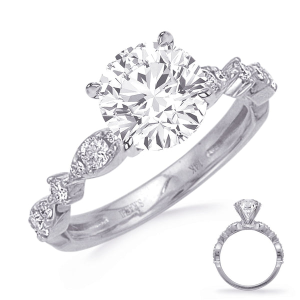 This Engagement Ring is available in 14K White Gold. There are a total of 14 stones. There are Rounds with a total carat weight of 0.34 set in a Prong Set|Shared Prongs setting.