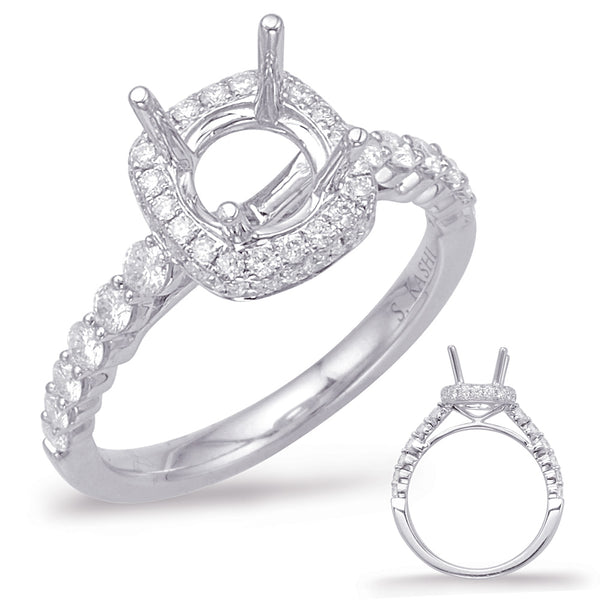 This Engagement Ring is available in 14K White Gold. There are a total of 52 stones. There are Rounds with a total carat weight of 0.68 set in a Micro Pave|Shared Prongs setting.