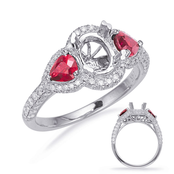 This Engagement Ring is available in 14K White Gold. There are a total of 102 stones. There are Rounds with a total carat weight of 0.4 set in a Micro Pave|Prong Set setting.There are Ruby stones with a total carat weight of 0.46 set in a Micro Pave|Prong Set.
