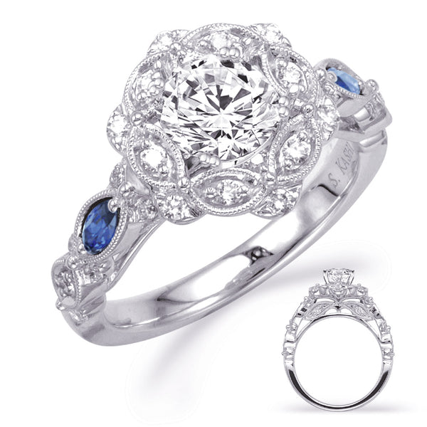 This Engagement Ring is available in 14K White Gold. There are a total of 34 stones. There are Rounds with a total carat weight of 0.32 set in a Channel Set|Prong Set setting.There are Sapphire stones with a total carat weight of 0.16 set in a Channel Set|Prong Set.