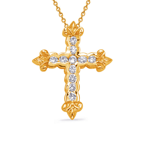 This Pendant is available in 14K Yellow Gold. There are a total of 11 stones. There are Rounds with a total carat weight of 0.25 set in a setting.