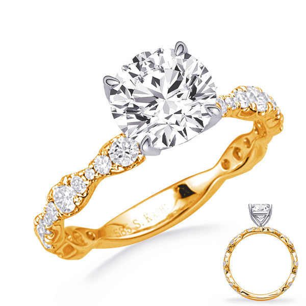 This Engagement Ring is available in 14K Yellow & White Gold. There are a total of 32 stones. There are Rounds with a total carat weight of 0.58 set in a Prong Set setting.