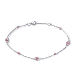 This Bracelet is available in 14K White Gold. There are a total of 43 stones. There are Round with a total carat weight of 0.14 set in a Bezel Set|Channel Set|Micro Prong setting.There are Ruby stones with a total carat weight of 0.3 set in a Bezel Set|Channel Set|Micro Prong.