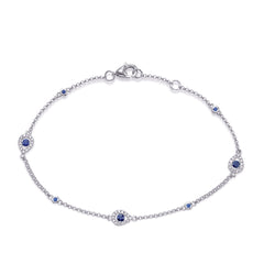 This Bracelet is available in 14K White Gold. There are a total of 49 stones. There are Round with a total carat weight of 0.11 set in a Bezel Set|Micro Prong setting.There are Sapphire stones with a total carat weight of 0.28 set in a Bezel Set|Micro Prong.