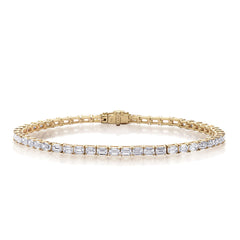 This Bracelet is available in 14K Yellow Gold. There are a total of 51 stones. There are Emerald Cut with a total carat weight of 4.65 set in a Prong Set setting.