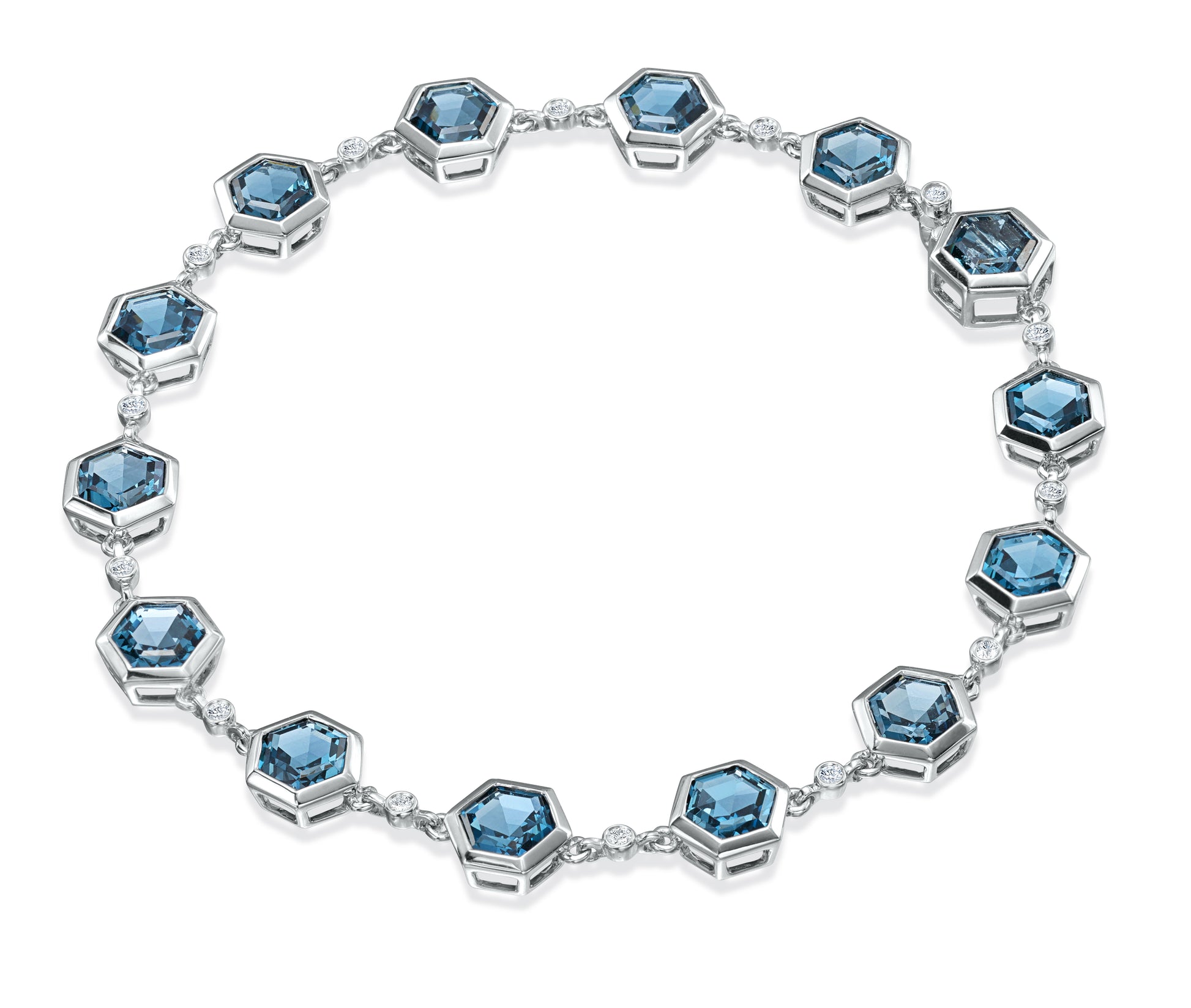 This bracelet sparkles with 14 round diamonds (0.10 ct) and fourteen 5 mm hexagon-cut London blue topaz stones totaling 9.00 ct. A bold and modern statement piece.