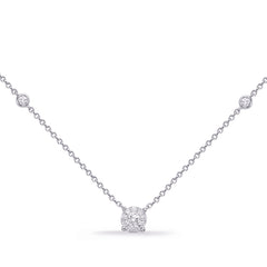 This Necklace is available in 14K White Gold. There are a total of 14 stones. There are Rounds with a total carat weight of 0.27 set in a Bezel Set|Micro Prong|Prong Set setting.