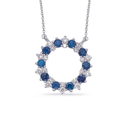 This Necklace is available in 14K White Gold. There are a total of 30 stones. There are Rounds with a total carat weight of 0.49 set in a Prong Set setting.There are Sapphire stones with a total carat weight of 1.32 set in a Prong Set.