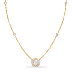 This Necklace is available in 14K Yellow Gold. There are a total of 34 stones. There are Rounds with a total carat weight of 0.58 set in a Bezel Set|Micro Prong setting.