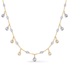 This Necklace is available in 14K Yellow & White Gold. There are a total of 21 stones. There are Rounds with a total carat weight of 0.71 set in a Bezel Set setting.