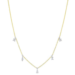 14K yellow gold prong set stations necklace set with 0.50 carat round, emerald, marquise and pear shape brilliant diamonds.