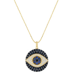 14K yellow gold EVIL EYE medallion necklace set with 0.23 carat round brilliant diamonds and 1.33 carat black and blue sapphire. The pendant is detailed with black rhodium. Chain sold separately.