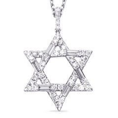 This Pendant is available in 14K White Gold. There are a total of 47 stones. There are Baguette with a total carat weight of 0.23 set in a Channel Set|Micro Prong setting.There are Rounds stones with a total carat weight of 0.4 set in a Channel Set|Micro Prong.