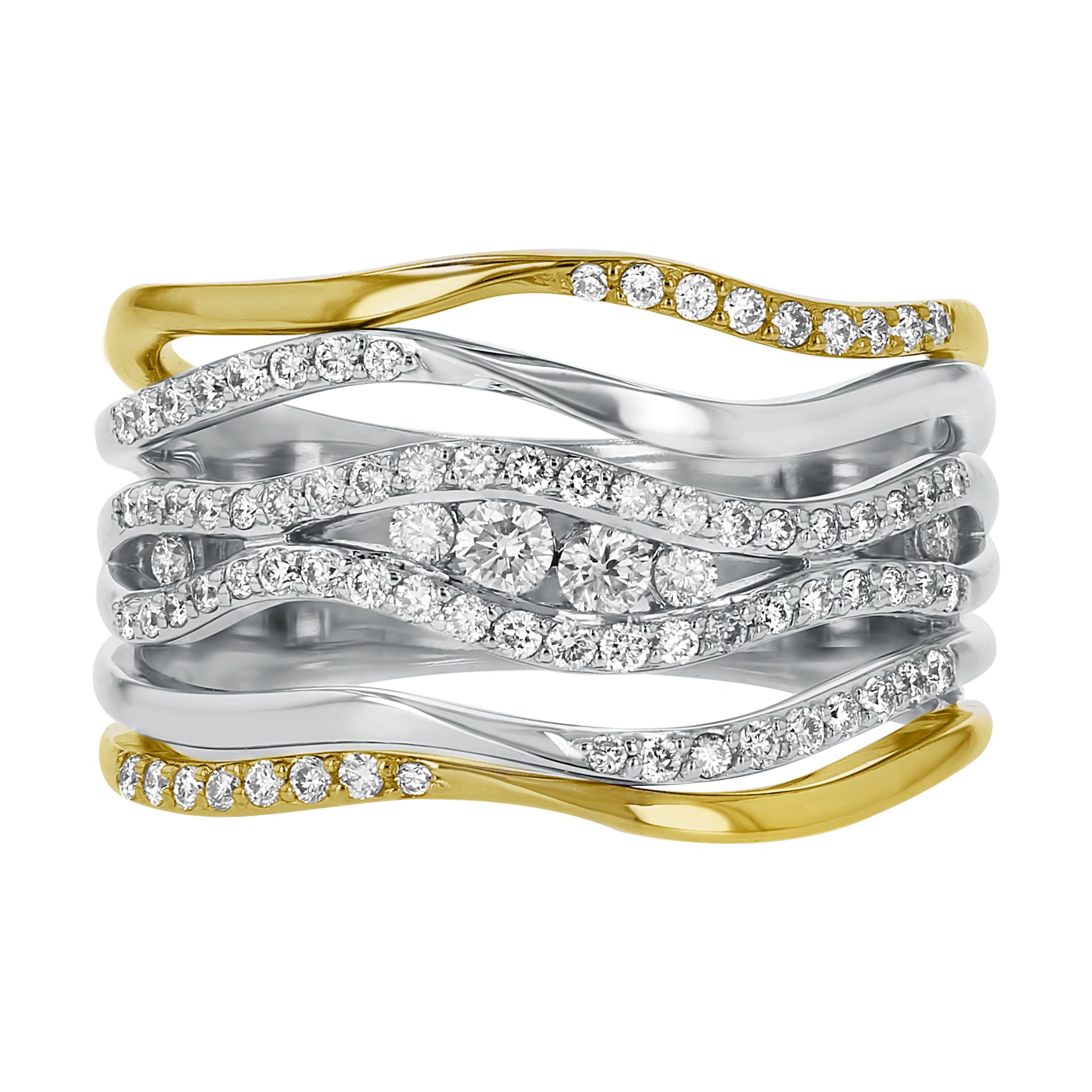 14K two tone yellow and white gold geometric ring set with 0.50 carat round brilliant diamonds and high polish finish.