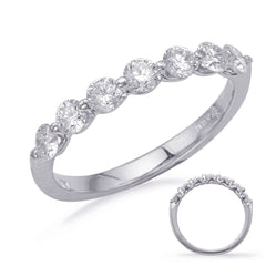 This Band is available in 14K White Gold. There are a total of 7 stones. There are Round with a total carat weight of 0.79 set in a Shared Prongs setting.