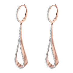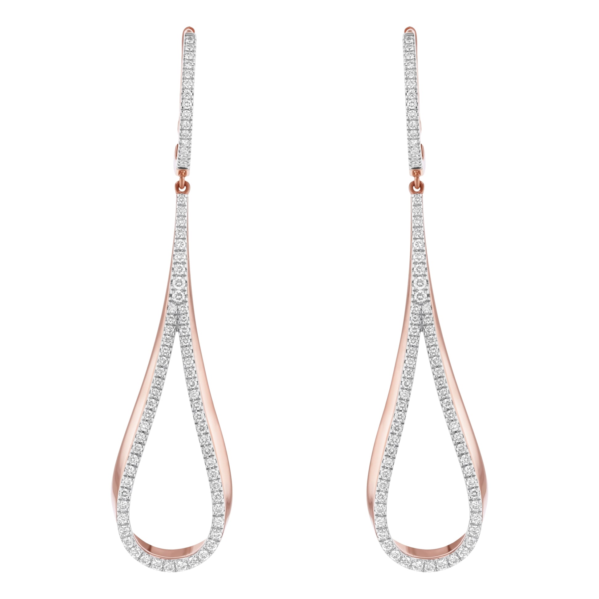 14K rose gold tear drop shape earrings set with 0.75 ct. round diamonds and dangling from hoops.
