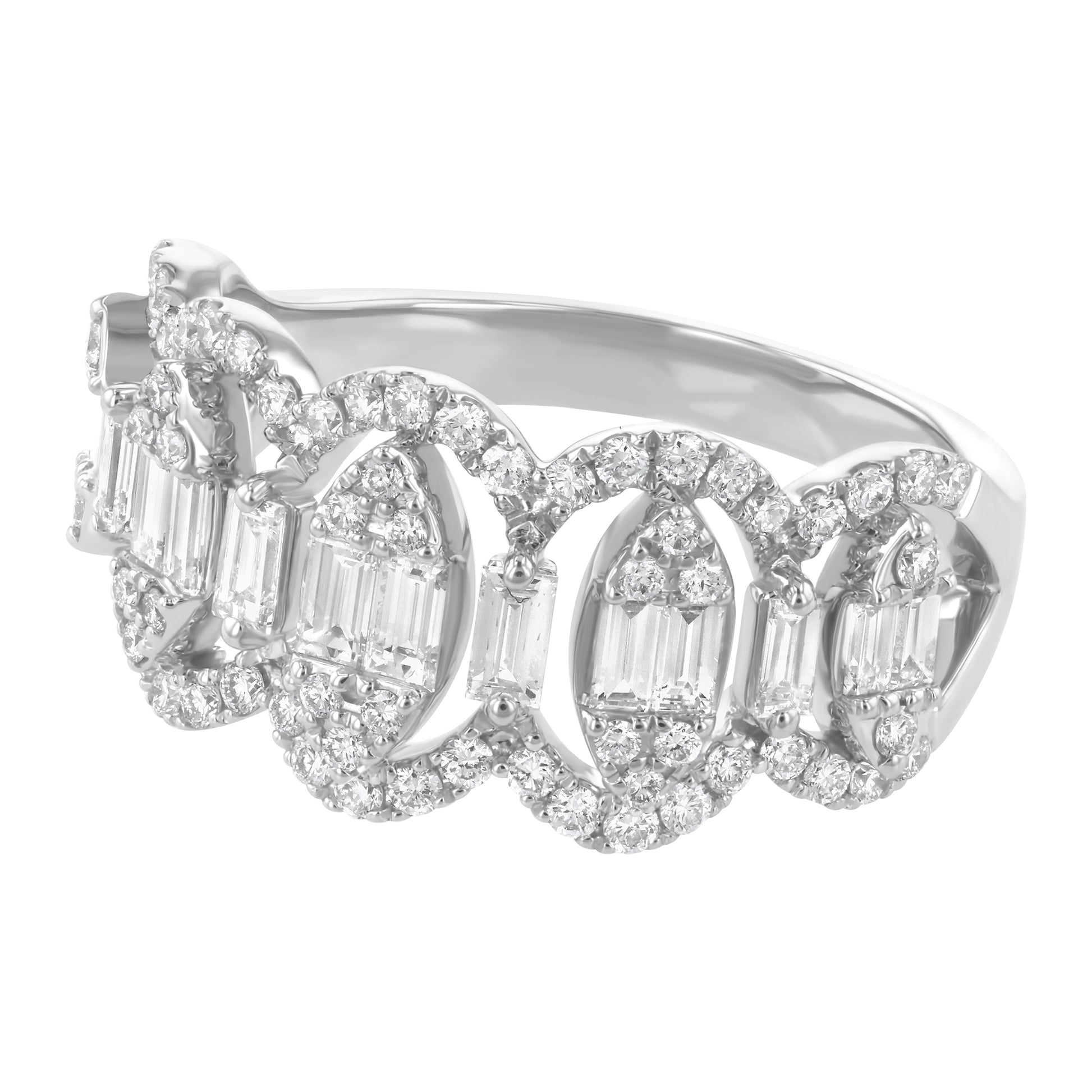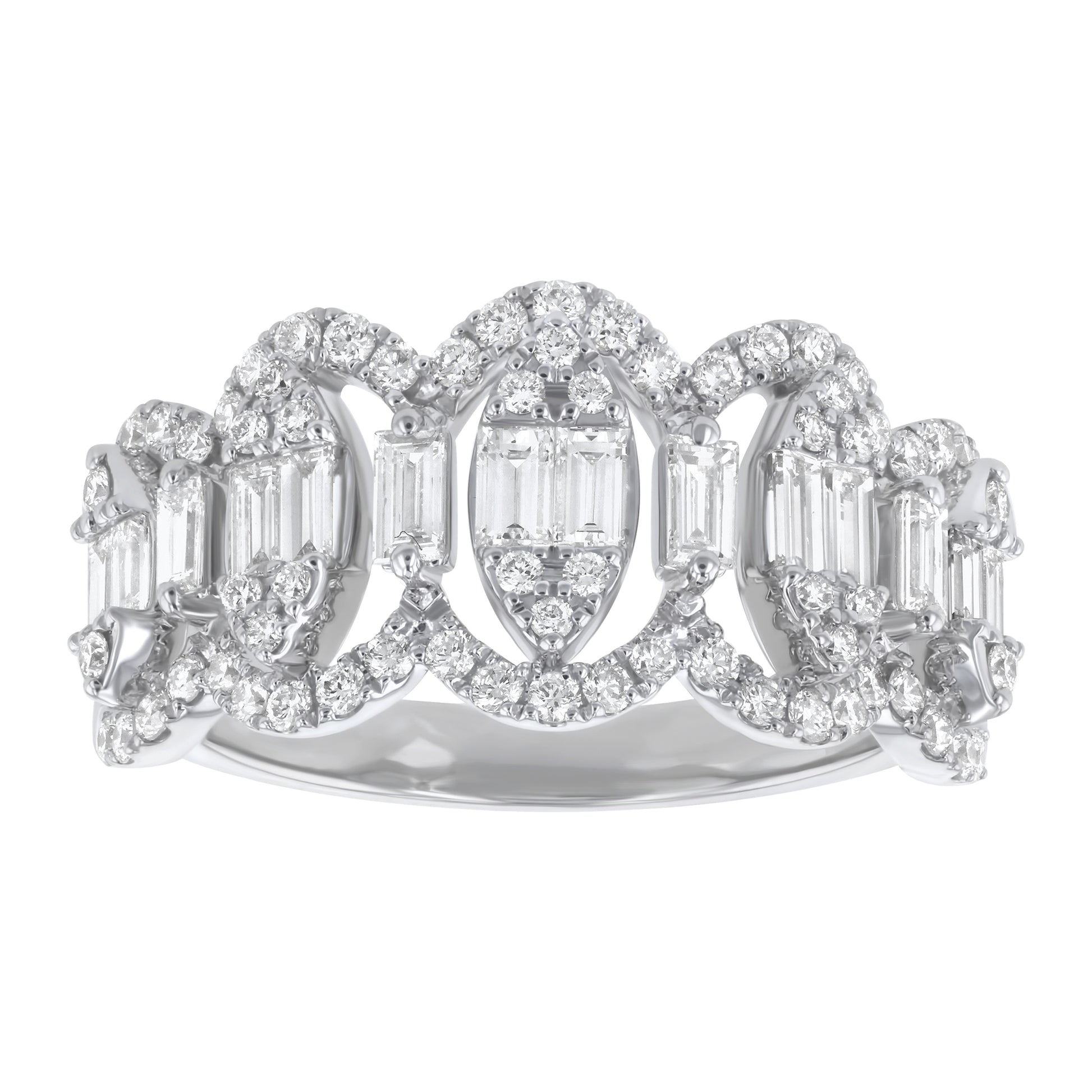 14K white gold wide band ring set with 1.10 carat baguette and round brilliant diamonds and high polish finish.