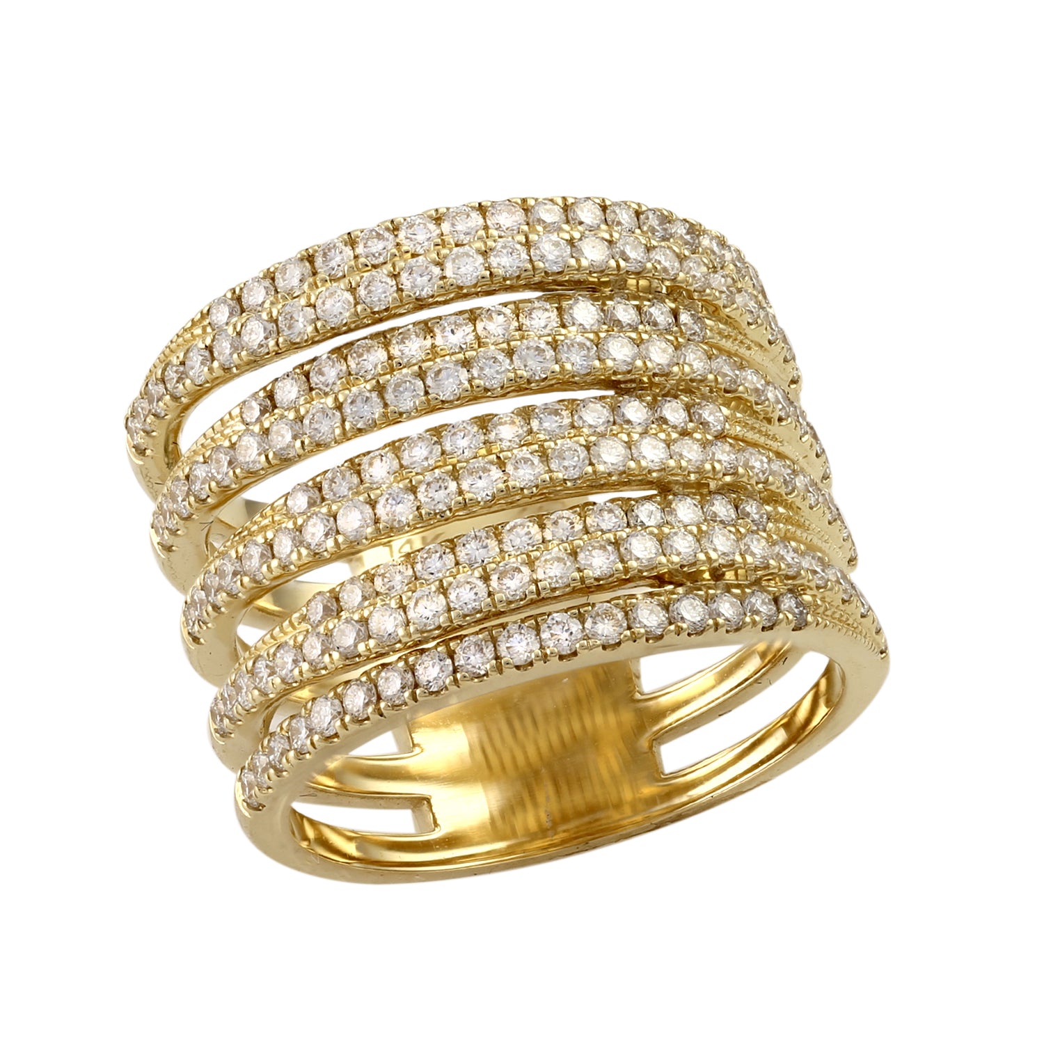 14K yellow gold multi row wide fashion ring set with 1.50 carat round brilliant diamonds and high polish finish.