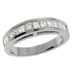 This Band is available in 14K White Gold. There are a total of 12 stones. There are Princess with a total carat weight of 0.9 set in a Channel Set setting.