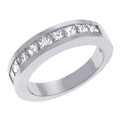 This Band is available in 14K White Gold. There are a total of 9 stones. There are Princess with a total carat weight of 1.05 set in a Channel Set setting.