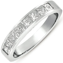 This Band is available in 14K White Gold. There are a total of 8 stones. There are Princess with a total carat weight of 1.08 set in a Channel Set setting.