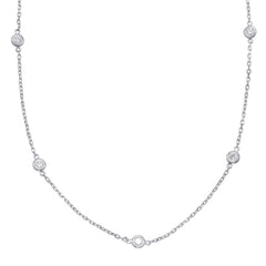 This Necklace is available in 14K White Gold. There are a total of 10 stones. There are Rounds with a total carat weight of 0.49 set in a Bezel Set setting.