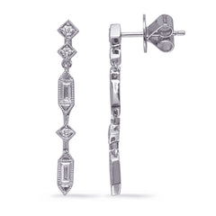 This Earring is available in 14K White Gold. There are a total of 10 stones. There are Baguette with a total carat weight of 0.28 set in a Channel Set|Micro Prong setting.There are Rounds stones with a total carat weight of 0.08 set in a Channel Set|Micro Prong.
