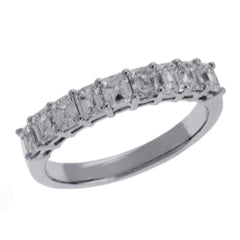This Band is available in 14K White Gold. There are a total of 9 stones. There are Emerald Cut with a total carat weight of 1.7 set in a setting.