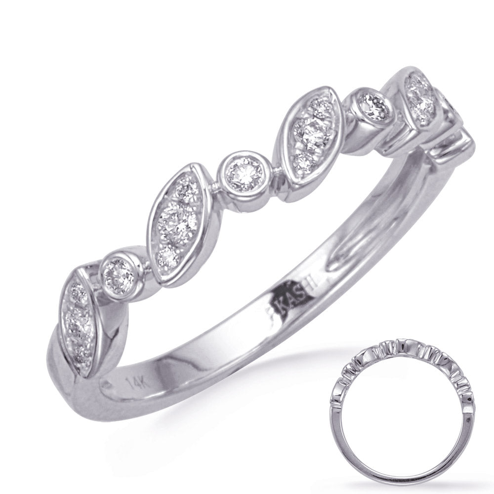 This Band is available in 14K White Gold. There are a total of 19 stones. There are Round with a total carat weight of 0.19 set in a Bezel Set|Micro Pave setting.