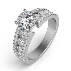 This Engagement Ring is available in 14K White Gold. There are a total of 50 stones. There are Rounds with a total carat weight of 1.08 set in a Channel Set|Micro Prong setting.