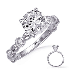 This Engagement Ring is available in 14K White Gold. There are a total of 6 stones. There are Rounds with a total carat weight of 0.3 set in a Bezel Set setting.