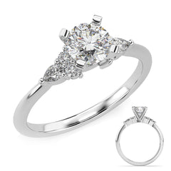 This Engagement Ring is available in 14K White Gold. There are a total of 6 stones. There are Pear Shape with a total carat weight of 0.15 set in a Prong Set setting.There are Rounds stones with a total carat weight of 0.14 set in a Prong Set.
