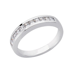 This Band is available in 14K White Gold. There are a total of 11 stones. There are Princess with a total carat weight of 0.6 set in a Channel Set setting.