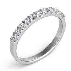 This Band is available in 14K White Gold. There are a total of 11 stones. There are Round with a total carat weight of 0.43 set in a Prong Set setting.