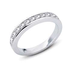 This Band is available in 14K White Gold. There are a total of 13 stones. There are Princess with a total carat weight of 1.1 set in a Channel Set setting.