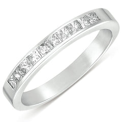 This Band is available in 14K White Gold. There are a total of 10 stones. There are Princess with a total carat weight of 0.4 set in a Channel Set setting.