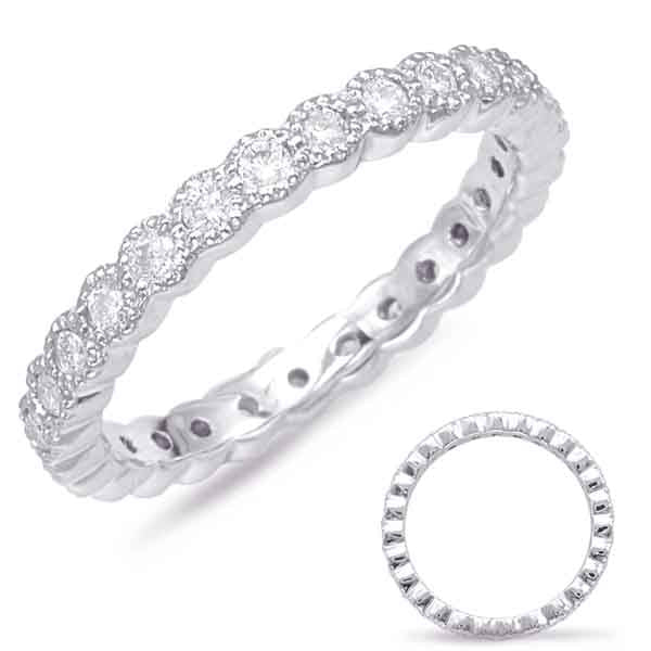 This Band is available in 14K White Gold. There are a total of 27 stones. There are Round with a total carat weight of 0.58 set in a Bezel Set setting.